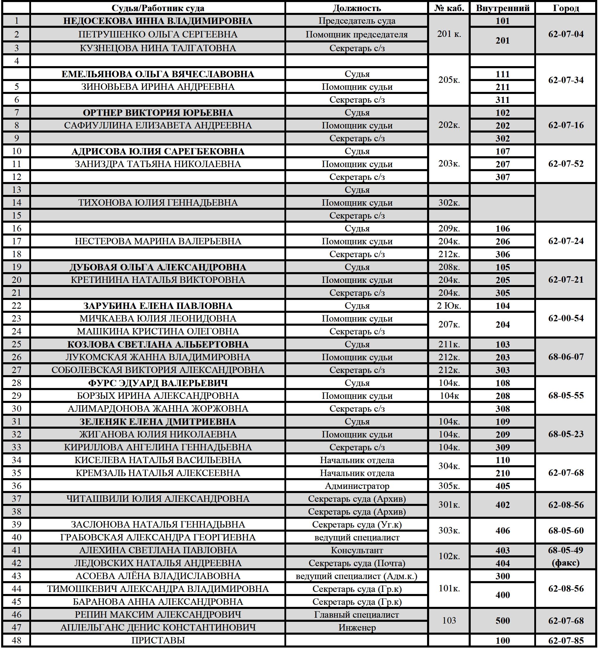 653045, Кемеровская область - Кузбасс, г. Прокопьевск, ул. Шишкина, д. 23Тел.: (3846) 62-07-68, (3846) 68-05-49 (ф.)rudnichniy-prk.kmr@sudrf.ru
